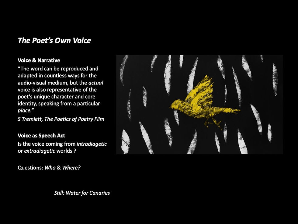 'the potential of the poetry film to extend the voice of the poet through devices such as synchronous text' S Tremlett, The Poetics of Poetry Film